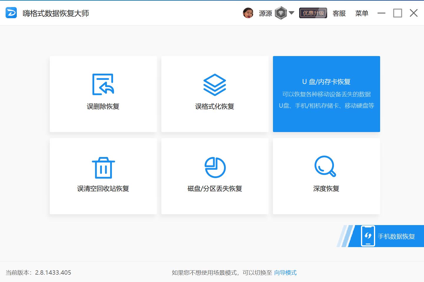 1、u盘数据恢复工具怎么使用,下载并运行嗨格式数据恢复大师,点击“U盘/内存卡恢复”模式。