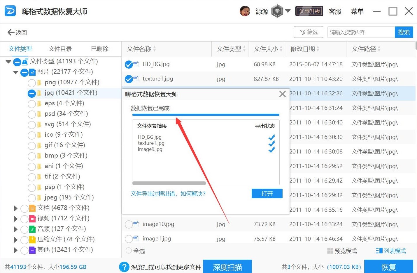 3、数据扫描好后,选择要恢复的文件,点击“恢复”按钮。