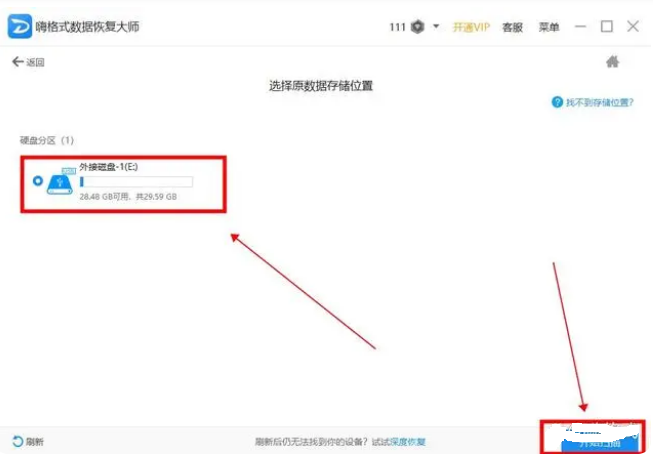 步骤二、选择“原数据文件所存储的位置”,选择扫描模式后一般会自动切换到文件存储磁盘界面中,此处可直接选择对应误删数据的磁盘,点击“开始扫描“按钮;