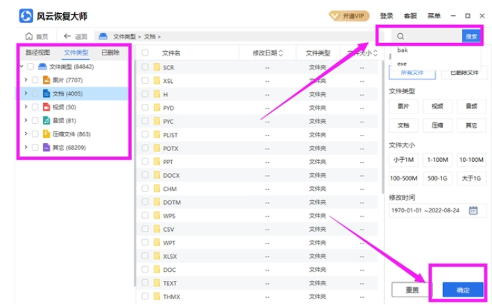 2、等待扫描结束后,文件都显示出来了,大家可以在右上方的搜索框里输入文件的类型等进行筛选,或者在左边位置进行文件类型选择。