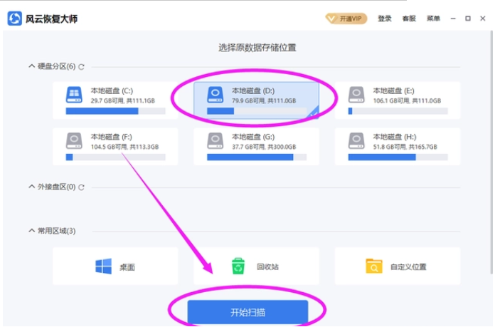 1、打开自行下载安装好风云恢复大师,在页面上选择好扫描恢复的分区,这里以为硬盘D盘为例,开始扫描。