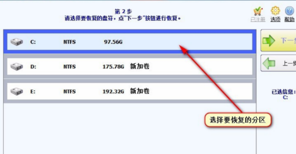 2.选择我们所需要恢复的硬盘盘符。