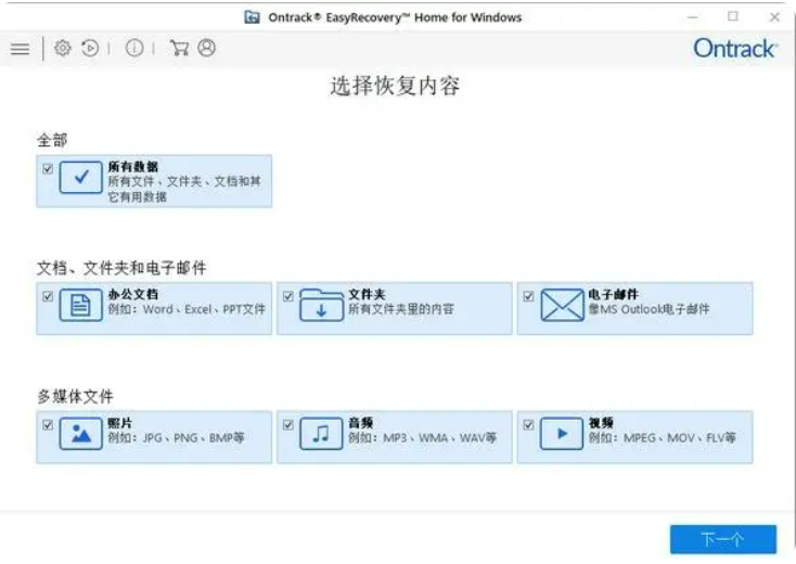 EasyRecovery硬盘数据恢复工具不仅仅是基本的恢复本地本机的文件内容,移动设备的数据一样可以恢复,比如U盘这个外接设备,在进入软件之后会看到恢复内容的几个板块,比如所以数据恢复里面包含了所有文件,文件夹,文档,音频等等数据,还有单独的文件夹,电子邮件数据恢复功能,还有多媒体文件恢复功能,比如MP3,PNG,BMP等等内容,包括视频文件和音频文件等等,恢复算法强大,基本上都能完全修复。