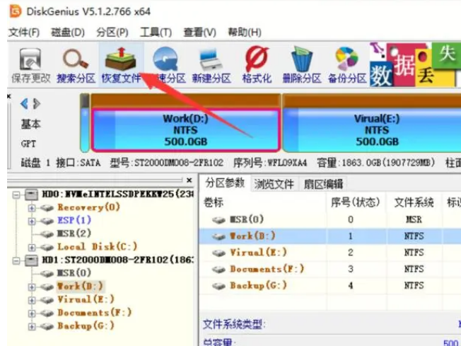1、运行DiskGenius软件,选择需要恢复文件的分区,点击“恢复文件”按钮。