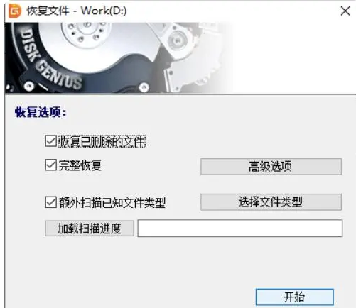 2、进入恢复文件窗口中,默认设置并点击“开始”按钮开始扫描。