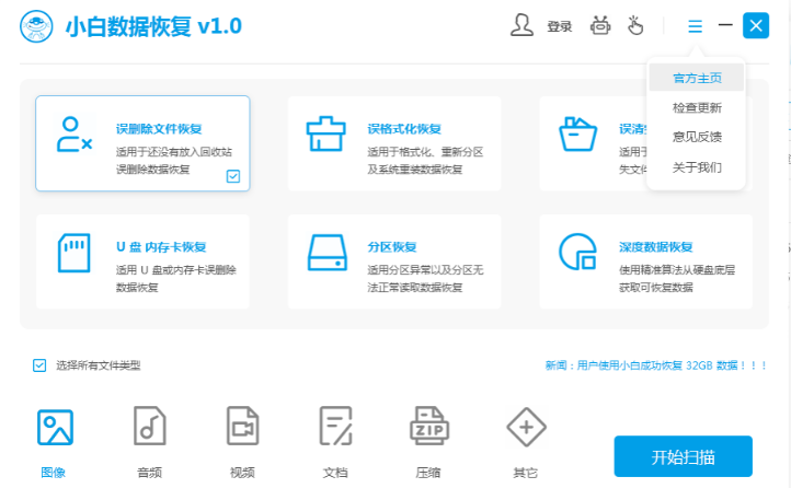 1)双击启动小白数据恢复软件,选择主界面下的“u盘 内存卡恢复”选项,进行精确选择数据文件恢复类型,然后点击“开始扫描”。