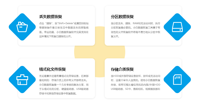 小白数据恢复软件是一款专业高效安全的电脑数据恢复软件,目前软件支持恢复超1000种文件格式,无论是电脑、硬盘、存储卡、U盘,还是SD、NM卡等外接数据存储设备,都可以通过小白数据恢复大师找回。