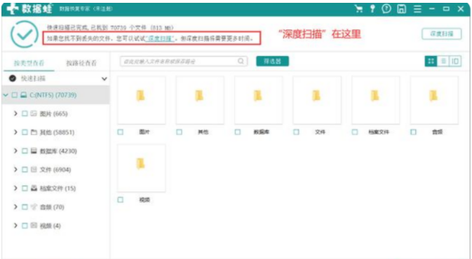 2、大家可能会发现,第一次扫描后并没有找到全部的丢失数据,那是因为第一次扫描追求速度,相当于杀毒软件的快速扫描,所以这种情况我们点击“深度扫描”即可,对应杀毒软件的全盘扫描,等待时间稍久,但扫描质量提升数倍!