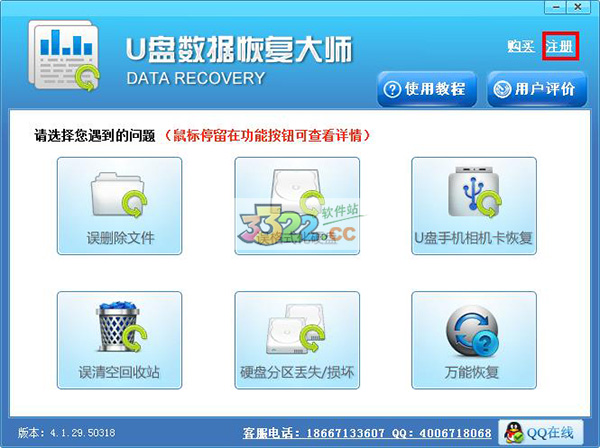 1、下载安装运行u盘数据恢复大师,点击注册。