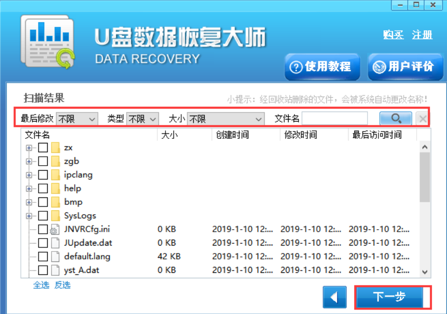 4、U盘数据恢复大师软件扫描完成后,可以在界面中看到删除的文件,选中自己要恢复的文件,点击下一步。