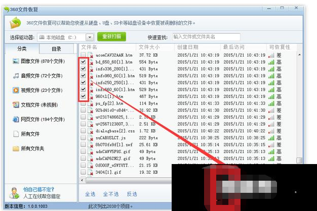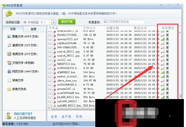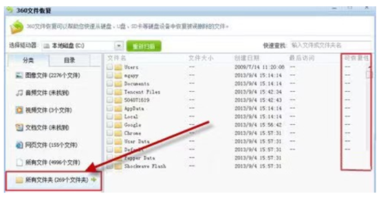 4、扫描进行后360文件恢复作用会显示遗失文件的状况,大家见到可恢复性分成好多个等级,可以选择自身要想恢复的文件试着开展恢复。此外也有一种是文件夹可恢复性为空缺的,此文件夹是可以恢复的,但是文件夹内部结构的文件很有可能已经被可读写,文件夹恢复后不一定能寻找需要的文件。