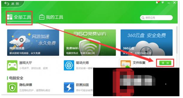2、选择所有工具,窗口中寻找文件恢复,点击添加。