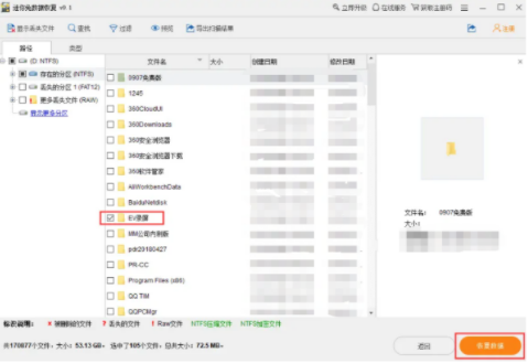 3、等待扫描结束,迷迷兔数据恢复工具此时将会显示所选分区的所有丢失数据,比方说我们丢失的文件在【EV录屏】中,勾选它,再点击右边的【恢复数据】。