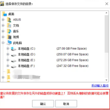 4、最后将会弹出恢复文件保存的目录窗口的页面,需要注意的是不要保存在文件原来的位置,因为这样会对原来位置的数据导致二次覆盖,选择保存位置,点击【确定】,文件即可成功恢复到所需磁盘位置。