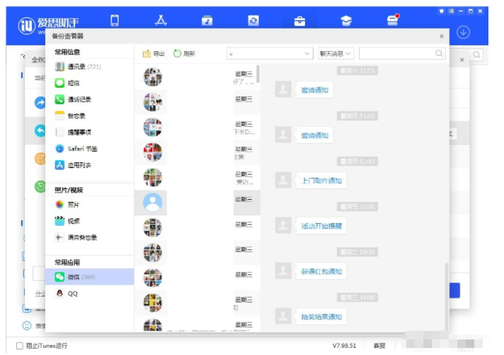 这款软件相信大家用的比较频繁,但也有弊端,爱思助手还能够查看微信聊天记录的备份,但不可以单独保存所有微信聊天记录,只能在查看微信记录前进行完整备份,并且只能以纯文本方式导出聊天记录。而且没有增量模式,每次都要重新备份等等。