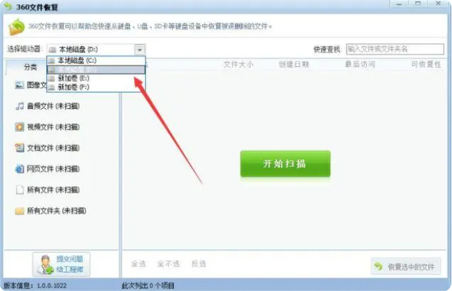 2、进入360文件恢复窗口,点击选择需要恢复的驱动,开始扫描电脑数据。