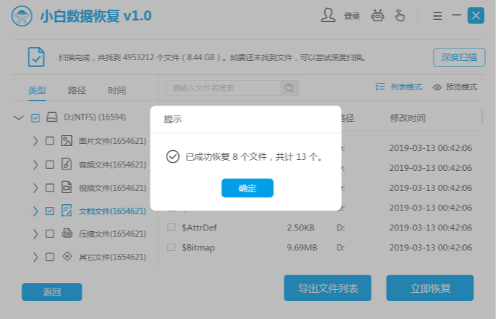 3、扫描完成后,点击“文件类型”,在其下的数据文件目录树下,查找并勾选要恢复的数据文件,点击“立即恢复”,等待恢复完成即可。