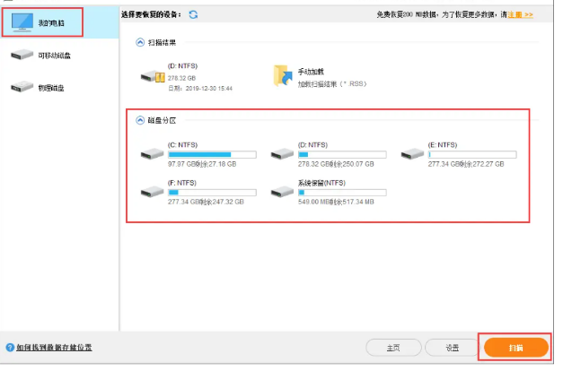 2、选择系统分区,点击扫描。