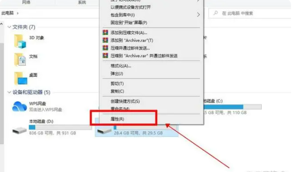 步骤2:找到U盘图标,右键点击U盘,在弹出选项中选择“属性”;