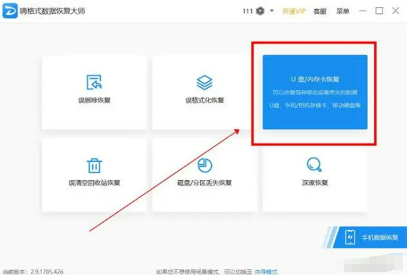 步骤1:打开数据恢复软件,我这里选择以【嗨格式数据恢复大师】为例,在软件的主界面中,点击“U盘/内存卡恢复”模式;