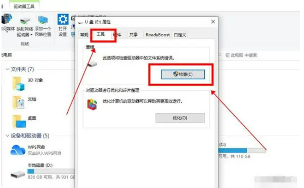 步骤3:在U盘属性窗口中,点击上面的“工具”,再选择点击“检查”按钮;