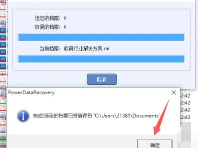 6、点击确定,数据就开始进行恢复。恢复成功后,将有一个提示框告诉我们恢复的数据存储在哪里。在该位置,就可找到恢复的数据了。