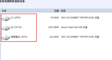 3、选择要恢复的盘符,选择该盘符,再点击右侧的“恢复”按钮,进入“恢复”界面。