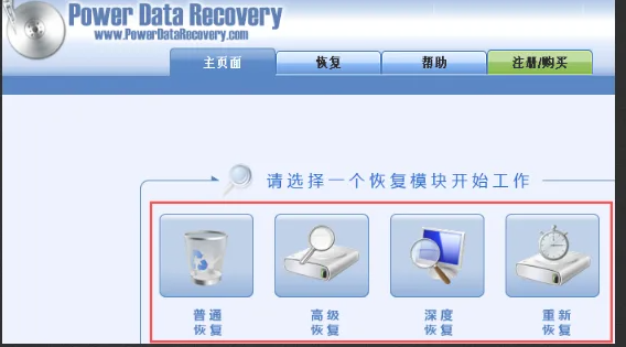 1、打开PowerDataRecovery软件,进入其主界面。这里有四种恢复模式,普通恢复、高级恢复、深度恢复、重新恢复。