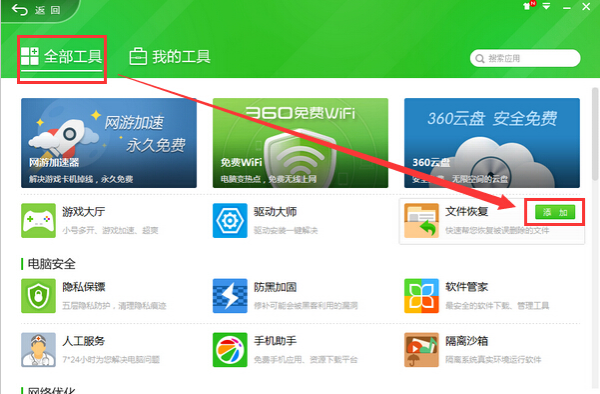 2.接着在界面里找到360数据恢复工具(文件恢复),点击添加。