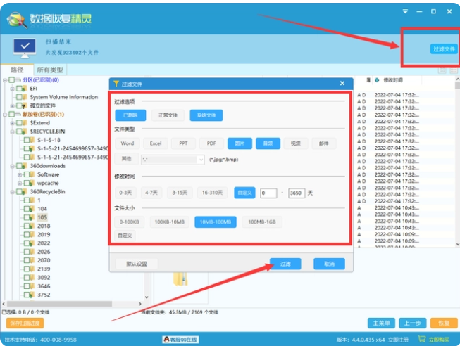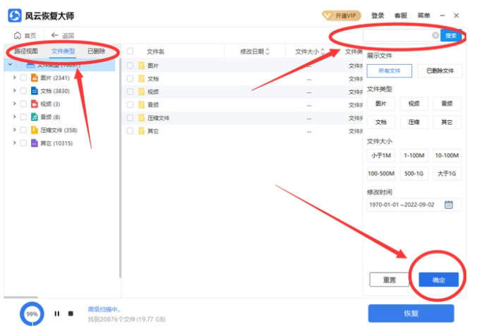 2、扫描结束之后,即可再筛选过滤条件,找到文件之后恢复即可。