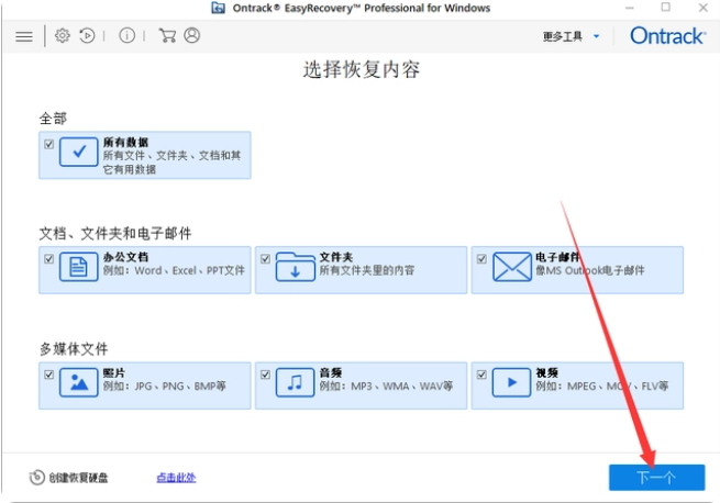 1、打开EasyRecovery,先选择要恢复的文件类型,也可以是所有文件类型,再选择从移动硬盘恢复,进行扫描。
