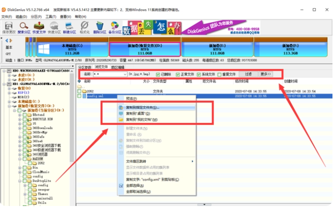 2、搜索完成之后,找到缺失数据的文件夹,进行过滤筛选,找到文件之后,鼠标右击,可以复制到电脑的指定位置,即完成恢复操作。
