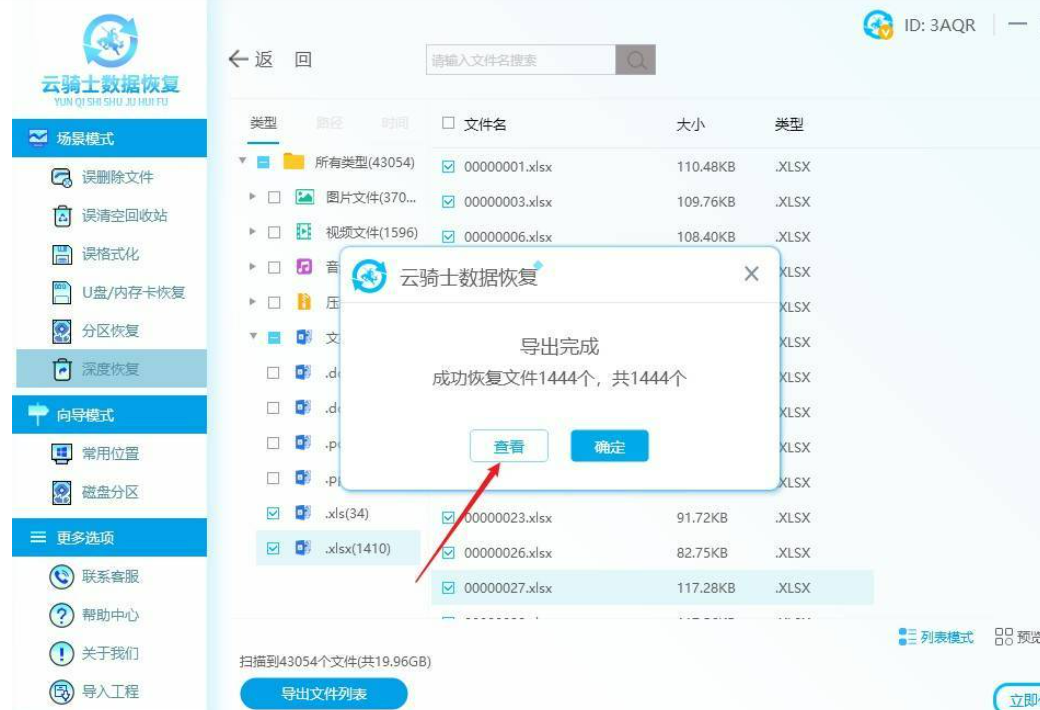 5、点击确定以后,软件会自动显示导出进程,等待导出完成以后点击【查看】,即可在设置路径中查看恢复出来的excel文件。