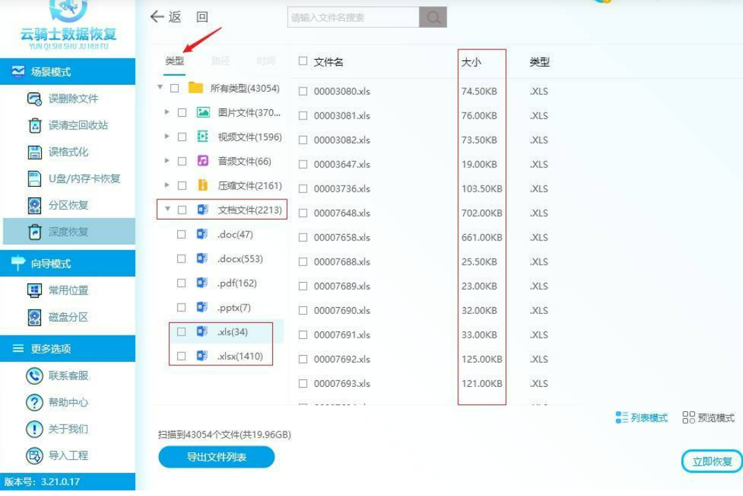 3、扫描结束后用户可以通过右侧【文档文件】类型下的xls和xlsx格式找到excel文件,或者通过文件【大小】方式来查找软件扫描出的文件。