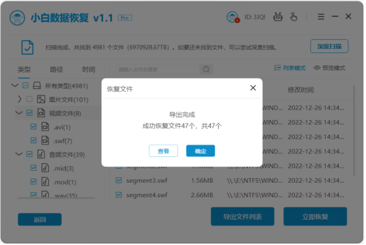 3、等待扫描完成后,选择需要恢复的文件类型,点击立即恢复,等待软件对这些数据进行恢复。