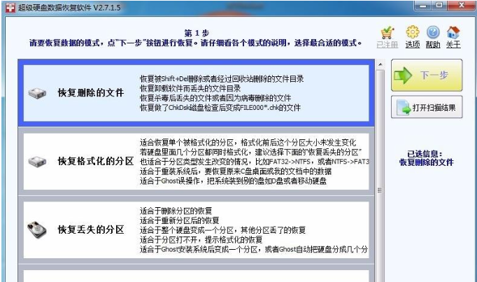 1、自行在电脑浏览器查找并下载安装超级硬盘数据恢复软件破解版,打开软件后选择以管理员身份运行,找到需要的恢复功能进入下一步,这里以“恢复删除的文件”为例。