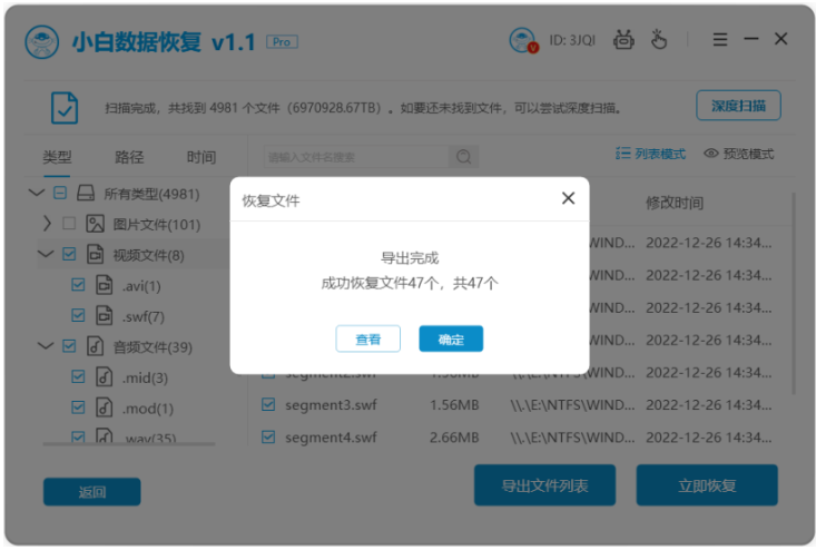 3、扫描完成后,选中需要恢复的文件,点击立即恢复。