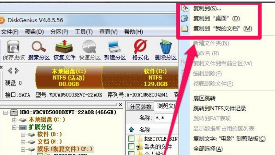 5、使用diskgenius查找出误删除的文件后我们可以选择需要恢复的文件,然后右键单击复制到指定位置就可以了。