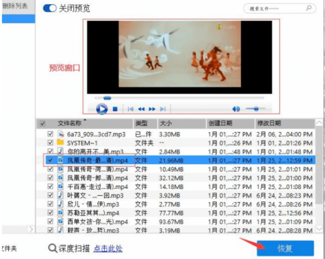 5.在右下角的预览列表界面中,选择你需要恢复的文件后,点击蓝色按钮“恢复”,这样此文件即可恢复到原来的位置了。