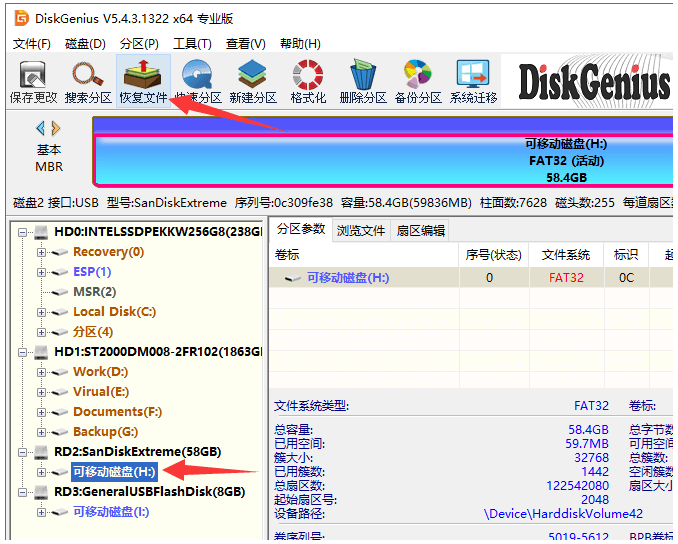 2、下载安装并运行DiskGenius数据恢复软件,选中丢失数据的存储卡,点击"恢复文件"。