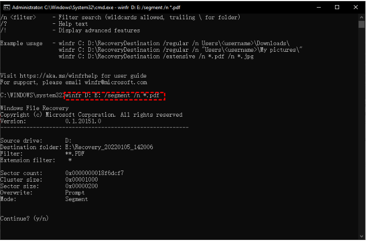 例如,如果需要将pdf文件从损坏的D: 驱动器恢复到E: 驱动器,那么就应该使用扩展模式;要过滤文件夹,请使用分段。得到的命令要输入的就是:winfr D: E: /segment /n *.pdf。
