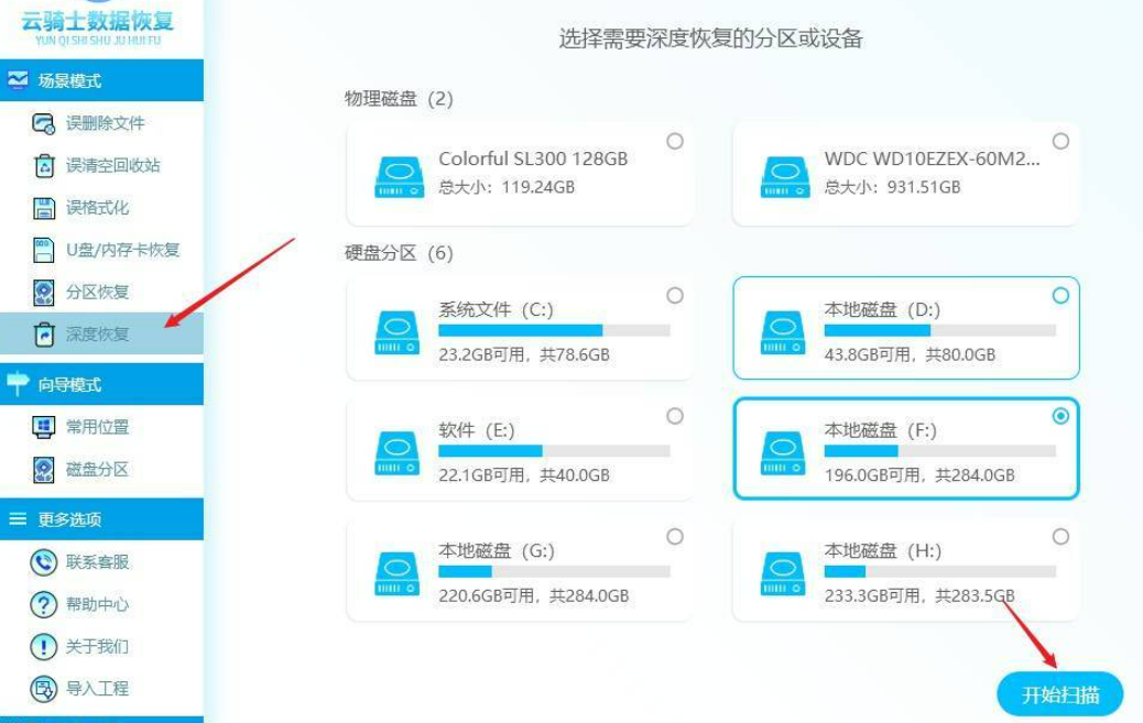 2、在桌面运行软件之后,接着在主界面点击场景模式下的【深度恢复】,找到丢失excel文件所在的磁盘,选择该磁盘,鼠标点击【开始扫描】。