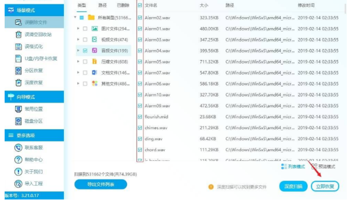 5、我们文件扫描完成后,可看到软件界面右侧有各种筛选方式,我们找到需要恢复的文件勾选后,然后单击“立即恢复”。