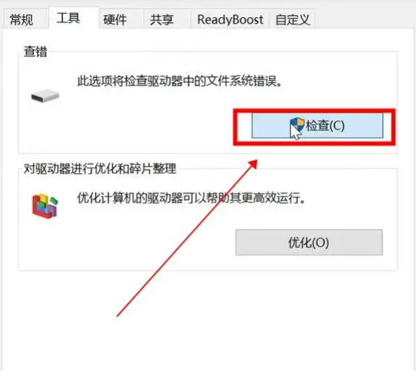 2、在属性页面中选择“工具”,然后点击页面右侧的“检查”按钮自动检查修复;