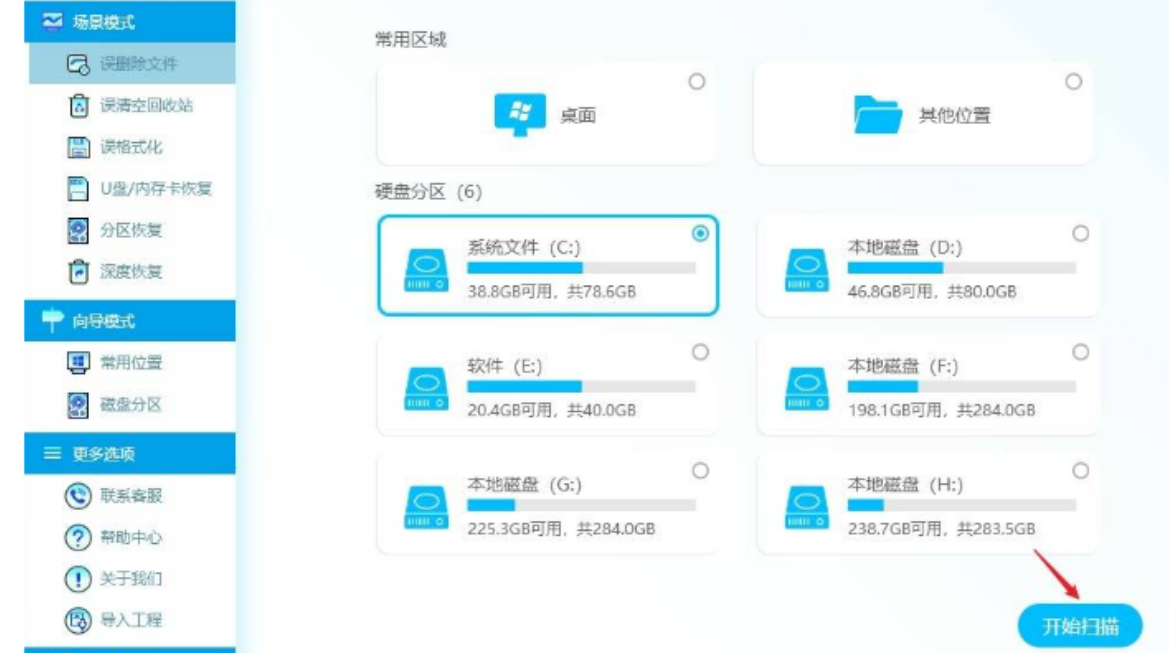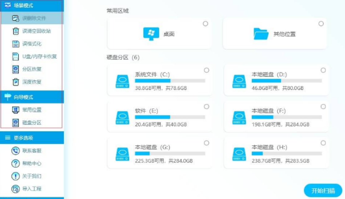 2、软件安装完毕,为尽早恢复数据,请立即运行软件,在打开的主界面左侧选择功能。这里以恢复误删文件为例,可选择场景模式下的“误删除文件”。