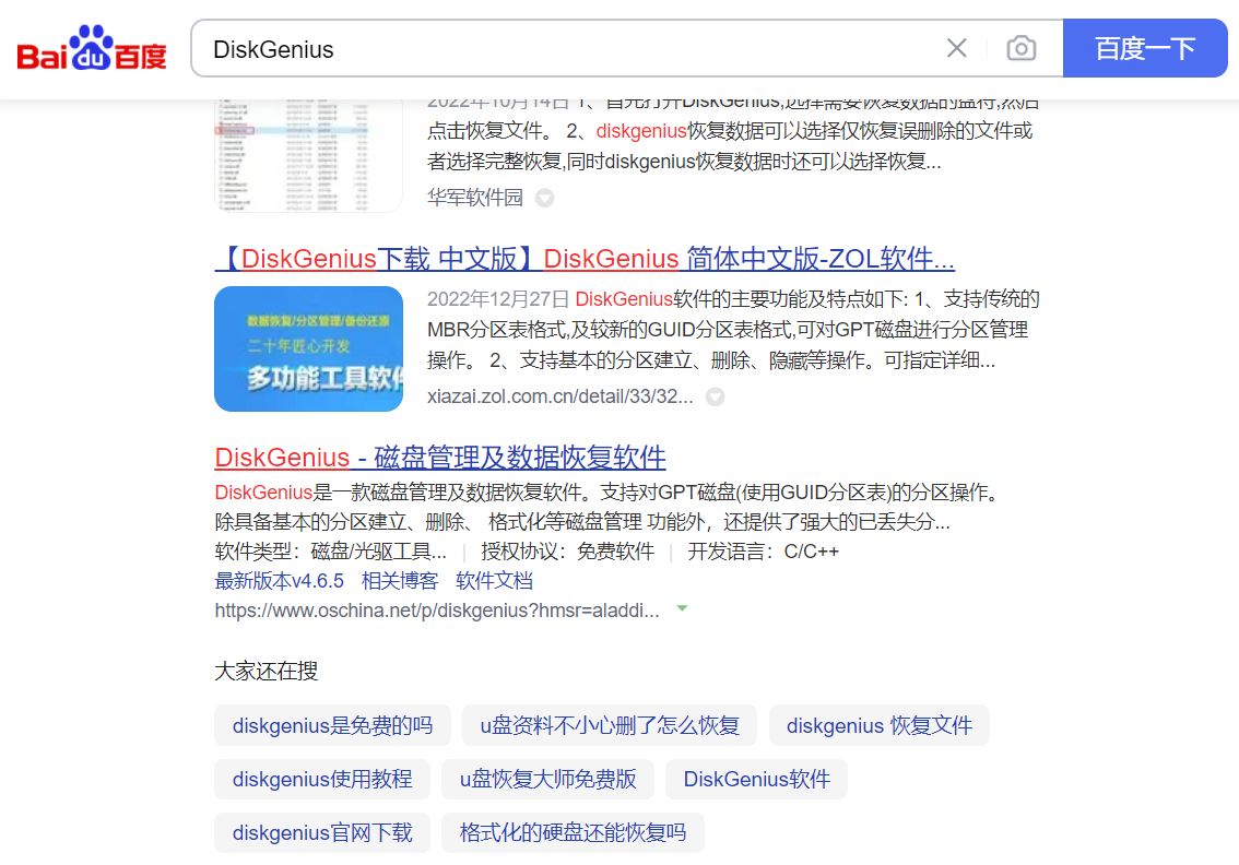 2.搜索并下载”DiskGenius“,安装并运行。