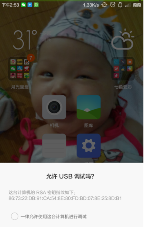 1.首先用手机数据线连接电脑,并在手机上“允许USB调测“。