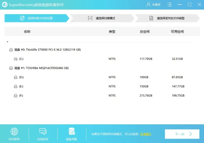 1、首先打开电脑上安装好的Superrecovery软件,进入到软件的“向导模式”,依次设置:需要恢复数据所在的位置、软件扫描的方式、需要恢复数据的类型等等。