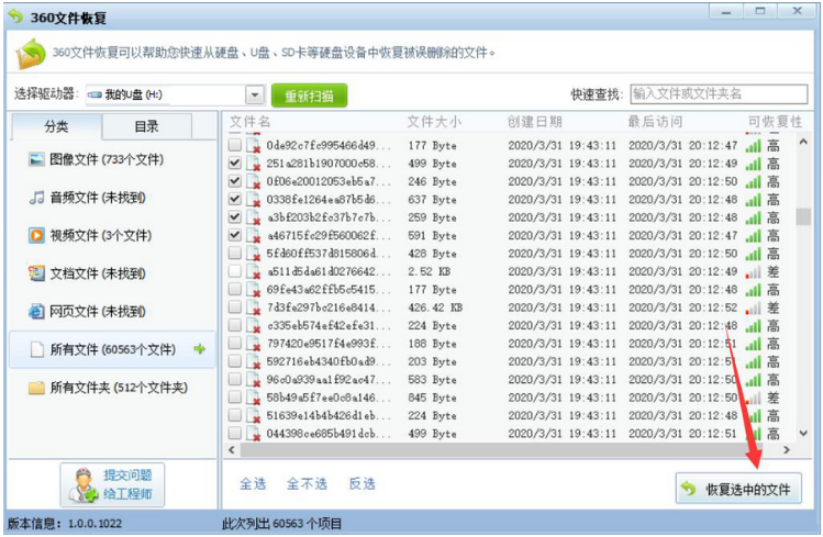 4、我们扫描完成后,可以选择需要恢复的文件,然后点击“恢复选中的文件”。
