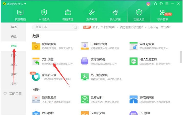 360安全卫士内也有内置的数据恢复工具,可以免费使用,尽管功能不如小白数据恢复软件,不过现在用它来恢复u盘的大部分数据效果还是可以的。具体的步骤如下: